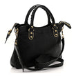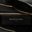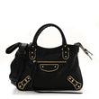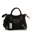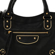 This is an authentic BALENCIAGA Chevre Gold Metallic Edge Hardware Town in Black. This luxurious handbag is crafted of rich chèvre goatskin leather in a black. The bag features rolled leather top handles with a woven detailing and an optional adjustable leather shoulder strap. The face of the bag is detailed with decorative polished gold trim fixtures with signature belts, buckles, and studs. The top zipper opens to a black fabric interior with a zipper and patch pockets.
