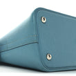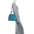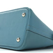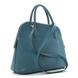 This is an authentic HERMES Taurillon Clemence Bolide 31 in Turquoise. This bowler-style handbag is crafted of goatskin leather in dark turquoise with lighter blue stitching. It features rolled leather top handles and a removable shoulder strap with palladium-plated hardware. The top zipper opens to a blue leather interior with a patch pocket.