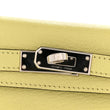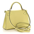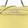This is an authentic HERMES Chevre Mysore Mini Kelly Sellier 20 in Jaune Bourgeon. This iconic mini Kelly bag is finely crafted of textured leather in a vibrant yellow-green with classic Kelly features including a top handle, optional shoulder strap, and palladium hardware. The front flap opens to a matching leather interior with a flat pocket.