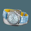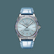 Unworn Ladies watch Breitling Chronomat Automatic 36 South Sea, case brushed and polished Stainless Steel and 18k White Gold, Diamonds and Gem, Reference G10380611C1P1. Meticulously crafted to embody elegance and functionality, this timepiece exudes a timeless charm that captivates the discerning eye. Crafted with meticulous attention to detail, they have an impeccable Ice blue dialwith a fine sunray finish, which is decorated with a 18k White Gold «B" emblem below the 12 o'clock position. Perfect hour markers made of polished 18k White Gold with crystal clear diamonds instead of luminous dots fill the dial with special luxury. Polished 18k White Gold hands with luminous filling ensure high readability even in the dark. The slender 18k White Gold seconds hand has a special design, having an arrowhead with luminescent filling and the manufacturer’s logo “B” on the other side. Along the outer perimeter of the dial is a finely printed minute/second track with Arabic numerals every 5 minutes. Date window located at the 6 o'clock position. The dial closed by a Cambered Scratch-resistant Sapphire Crystal with glare-proofed both sides. A screw-on, durable case back securely covers the watch mechanism. The non-screw-lock crown with two gaskets, has a ribbed edge for easy grip, and features the Breitling logo on the end. The watch features a polished 18k White Gold bezel with a Gemstone-Set. The Model comes with Breitling Caliber 10 contains 25 Jewels and has an approximate power reserve of 42 hours. She is presented on Breitling's iconic and comfortable Blue alligator leather strap with contrasting off-white stitching, which fastens on Stainless Steel Folding Clasp. The water resistance is up to 100m/330ft.