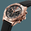 Unworn watch Breitling Chronomat B01 42, case brushed and polished 18k Red Gold, Reference RB0134101B1S1. A bold and dynamic timepiece that embodies the spirit of modern adventure and technical excellence. Crafted with meticulous attention to detail, these timepieces are a combination of robust functionality and contemporary style, designed to meet the needs of today's active lifestyle. The striking Anthracite dial features contrasting 18k Red Gold hands with luminous fill and applied polished 18k Red Gold index hour markers with luminous fill for exceptional legibility at a glance. Complete with chronograph black sub-dials and 18k Red Gold "B" emblem below the 12 o'clock position this watch is both functional and stylish. Black dial flange with Tachymeter scale and fine printed minute/seconds track intervals on the outer perimeter dial. Date window located at the 6 o'clock position. Small seconds sub-dial at 9 o'clock. The dial closed by a Cambered Scratch-resistant Sapphire Crystal with glare-proofed both sides. The transparent sapphire crystal case back reveals the mesmerizing operation of the movement. The polished Stainless Steel Screw-locked “onion” crown with two gaskets, a classic Chronomat feature named for its fluted-dome shape allows for easy adjustments. On its end there is Breitling logo is applied. Chronograph/Stopwatch functions: column wheel mechanism; the slender seconds hand has a special design, having Red an arrowhead with luminescent filling and the 18k Red Gold manufacturer’s logo “B” on the other side; 30-minute counter sub-dial located at the 3 o'clock position; 12-hour counter sub-dial at the 6 o'clock position. On the right side, case also houses the 18k Red Gold chronograph buttons a cylindrical shape. The watch is equipped polished 18k Red Gold unidirectional-ratcheted rotating bezel ring with brushed finished 1/4 hour rider tabs. The Model comes with Breitling Caliber B01 contains 47 Jewels and has an approximate power reserve of 70 hours. The watch presented on the Black Rubber Strap with 18k Red Gold Folding Clasp. The water resistance is up to 200m/660ft.