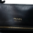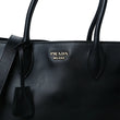 This is an authentic PRADA City Calfskin Medium Bibliothèque Tote in Black. This chic tote is crafted of city calfskin leather in black. This bag features rolled leather top handles, an optional shoulder strap, accordion style sides with a black strip, and a hanging clochette with a key ring. The top opens to a spacious fabric interior with zipper and patch pockets.