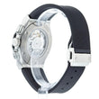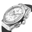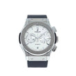 Hublot Classic Fusion Chronograph Titanium Opalin 45mm watch. Polished titanium case with brushed finished top and bottom center links between the lugs, Reference 521.NX.2611.LR. This model has Matte silver "Opaline" main dial with a contrasting metallic silvered sub-dials. Polished, rhodium-plated hands indicate the time. Applied brushed finish Stainless Steel "applique" style index hour markers. Minute markers around the outer rim. Small-seconds sub-dial located at the 3 o'clock position. Chronograph/Stopwatch function: large central seconds counter with the "H" logo as a counter-weight; 30-minute sub-dial counter located at the 9 o'clock position. Polished titanium chronograph buttons. Date window located the 6 o'clock positions. Polished titanium crown with Pull / Press function. On it, the Hublot logo engraved on it. The dial closed by a Scratch-resistant Sapphire Crystal with Anti-reflective Treatment. Of Sapphire Crystal made transparent case back. The watch is equipped fixed titanium bezel with brushed finished top and polished finished beveled edges, secured with 6 polished "H" style Titanium screws. Black composite resin "bezel lug" sandwiched between the bezel and case. The watch is self-winding mechanical Hublot Caliber HUB1143, contains 59 Jewels and has an approximate power reserve of 42 hours. This model presented on a Black Alligator/Crocodile Leather Strap with Lining of Black rubber stiched with Stainless Steel Deployant Buckle Clasp. The water resistance is up to 50m/150ft (5 ATM).