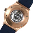 Hublot Classic Fusion King Gold Blue 45mm watch. Polished 18K King Gold case with brushed finished top and bottom center links between the lugs, Reference 511.OX.7180.LR. This model has Blue Sunray Satin-finished dial with applied brushed finished King Gold toned "applique" style index hour markers and polished King Gold plated hands. Date window located the 3 o'clock positions. Solid polished 18K King Gold screw-down crown engraved with Pull / Push function and the Hublot logo. The dial closed by a Scratch-resistant Sapphire Crystal with Anti-reflective Treatment. Of Sapphire Crystal, transparent case back made. The watch is equipped fixed solid 18K King Gold bezel, with a brushed finished top and polished finished beveled edge, secured with 6 polished "H" style titanium screws. Blue composite resin "bezel lug" sandwiched between the bezel and case. The watch is self-winding mechanical Hublot Caliber HUB1112, contains 21 Jewels and has an approximate power reserve of 42 hours. This model presented on Black rubber strap with a stiched Blue Alligator/Crocodile Leather Strap with 18K King Gold and Black PVD Stainless Steel Deployant Buckle Clasp. The water resistance is up to 50m/150ft (5 ATM).
