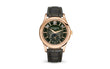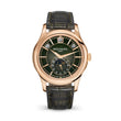 Unworn Luxury Patek Philippe Complication watch. The 18k Rose Gold Annual Calendar / Moonphases, 40mm, Reference 5205R-011. The model has elegant Olive green sunburst dial with black-gradient rim. The 18k Rose Gold faceted applied index hour markers and hands, the Patek Philippe logo at 12 o’clock. On the outer edge of the dial there is a minute scale consisting of 18k Rose Gold dots. The patented annual calendar is ingenious mechanism in three apertures arranged along an arc in the upper half of the dial. In its composition Date display at the 12 o'clock position, Day of the week display at the 10 o'clock position, Month display at the 2 o’clock position. Single combination sub-dial displaying: 24 hours and (inner moonphase) at the 6 o’clock position. Polished Pull/push18k Rose Gold crown that with ribbed edge for comfortable grip and logo Patek Philippe are located on the right side of the case. The dial closed by a Scratch-resistant Sapphire Crystal and Scratch-resistant Sapphire Crystal case back. The watch is fixed slightly concave 18k White Gold bezel. The highlight of this model is the delicately pierced lugs for strap. The watch Patek Philippe Caliber 324 S QA LU 24H/206 has Self-winding mechanical movement, containing 34 Jewels, and power reserve min. 35 hours, max. 45 hours. This model presented on shiny two-tone green hand-patinated alligator leather with square scales, handstitched secured by an 18k Rose Gold Prong buckle. The water resistance is up to 30m/100ft (3 ATM).