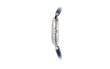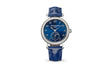 Luxury Ladies’ watch Patek Philippe Complication Moon Phases 18k White Gold, 33mm, Reference 7121/200G-001. The model has elegant Blue dial is enhanced by a sunburst decoration creating subtle light effects, and 18k White Gold intricate shape Poire hands. The dial decorate large applied Breguet 18k White Gold hour markers in the form Arabic numeral. On the outer edge of the dial there is a minute scale consisting of 18k White Gold dots. At the 6 o’clock position there is one sub-dial that stands out like stars in the night sky with a small second hand. Inside it, an indicator of the phases of the moon is organically inscribed inside. Screw-down Stainless Steel crown, that logo Patek Philippe. The dial closed by a Scratch-resistant Sapphire Crystal and Scratch-resistant Sapphire Crystal case back. A special highlight of this model is the 18K White Gold bezel with a double row of 132 (~1.09 cts.) brilliant-cut diamonds based on the exclusive lacy Dentelle gem setting technique. The watch Patek Philippe Caliber 215 PS LU has manually wound mechanical movement, containing 18 Jewels, and power reserve min. 39 hours, max. 44 hours. This watch presented on shiny blue Alligator leather with square scales, hand-stitched, and an 18k White Gold Prong buckle. The water resistance is up to 30m/100ft (3 ATM).