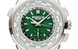 Luxury Patek Philippe Complication World-Time flyback chronograph, Platinum as attested by the diamond between the lugs at 6 o’clock, 39,5mm and Reference 5930P-001. Classicism and boldness. The highlight of this model is say it trendy, vibrant green dial. The circular guilloché pattern, applied by hand, is extremely refined and deservedly does not go unnoticed. Look good on dial applied 18k White Gold index hour markers with luminescent coating. The central Dauphine-style hour and minute hands are paired with a chronograph seconds hand. In the lower half of the green centre section, there is a 30-minute chronograph counter. Moving outward one-step, we find a two-tone day/night and 24-hour ring. Nestled in between that ring, and the outer city ring is the black on white chronograph-seconds track. Lastly, the outer ring shows all 24 time zones with corresponding cities, printed in green. It shows the time at a glance in all 24 time zones at any given moment. To change time zones, simply press the pusher at 10 o’clock and all displays will be simultaneously corrected. Polished Screw-down Platinum crown that with ribbed edge for comfortable grip and logo Patek Philippe with for the flyback chronograph Platinum buttons are located on the right side of the case. The dial closed by a Scratch-resistant Sapphire Crystal and sapphire-crystal case back which allows of the case, allows you to see the magical work of the movement. The watch is equipped fixed polished Platinum bezel. The watch Patek Philippe Caliber СН 28‑520 HU Self-winding mechanical movement, containing 38 Jewels, and has a power reserve of min. 50 hours – max. 55 hours. This model presented on shiny bottle green Alligator leather strap with square scales, hand-stitched and a platinum Fold-over clasp. The water resistance is up to 30m/100ft (3 ATM).