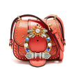 Miu Miu bag in orange color with madras leather and oversized ribbed-metal buckle, silver-tone metal decorative plaques, clear, orange, green and blue Swarovski crystal embellishmentdetails. Adjustable sliding shoulder strap. Gold-tone metal stud embellishment and hardware. Black lacquered edges. Metal logo back plaque with magnetic button-fastening front flap and decorative strap orange suede lining interior details. Under-the-flap slip pocket and one internal slip pocket