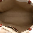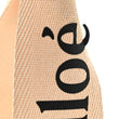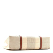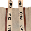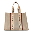 This is an authentic CHLOE Cotton Calfskin Large Woody Ribbon Tote in White and Brown. This chic tote is crafted of beige cotton canvas with brown calfskin leather. The bag features black Chloé logos vertically on the white fabric trim that extends into the top handles with brown leather accents. The top is open to a beige fabric interior with a patch pocket.