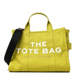 This is an authentic MARC JACOBS Cotton Canvas Medium The Traveler Tote Bag in Cirtine. This shoulder bag is crafted of yellow green canvas. It features The Toe Bag logo, canvas shoulder straps, and an optional adjustable black nylon shoulder strap. The top zipper reveals a spacious interior with a hanging zipper and flat pocket panel.