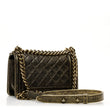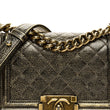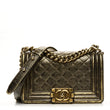 This is an authentic CHANEL Cracked Metallic Calfskin Quilted Small Boy Flap in Gold. This chic shoulder bag is crafted of diamond quilted metallic bronze calfskin leather. The bag features an aged brass chain shoulder strap with a shoulder pad, and a matching brass boy CC press lock on the crossover flap. This opens the bag to a light gold fabric interior with a patch pocket.