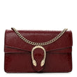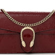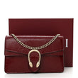 This is an authentic GUCCI Calfskin Mini Dionysus Shoulder Bag in Rosso Ancora Red. This petite bag is crafted of glossy patent leather in red. This shoulder bag features a gold chain shoulder strap and a gold textured horseshoe tiger spur closure. The double flap opens to a matching suede interior.