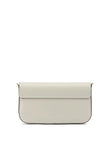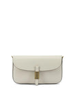 Crafted in a versatile cream tone, this structured piece features a sleek flap closure with distinctive gold-tone hardware that adds a luxurious finishing touch.