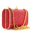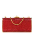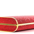 This is an authentic JUDITH LEIBER Crystal Minaudiere Clutch in Red. This lovely chic evening clutch is entirely encrusted in ruby red crystals. The shoulder bag features a polished gold chain link shoulder chain and gold trim. The top crystal press lock opens to a metallic gold leather interior. This is a magnificent case for evening with the elegant sophistication only from Judith Leiber!
