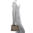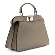 This is an authentic FENDI Calfskin Romano Selleria Small Peekaboo I SEE U Satchel in Corda, Camelia, and Cipria. This handmade tote is crafted of grained calfskin leather with hand stitching in taupe gray. The bag features a looping top handle and a turn-lock on either side that opens the bag to a cream and light pink leather interior.