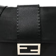This is an authentic FENDI Cuoio Romano Selleria Large Convertible Baguette in Black. This bag is crafted of black calfskin leather. The bag features an adjustable leather shoulder strap, a leather top strap, and silver hardware including a silver FF on the front flap. The flap opens to a black fabric interior with a zipper pocket.