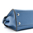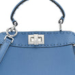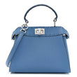 This is an authentic FENDI Cuoio Romano Selleria Macro Stitchings Mini Peekaboo Iconic Satchel in Argento Blue. This chic tote is crafted of grained calfskin leather with hand stitching in blue. It features a sturdy handle, silver hardware including handle links and a top interior structured frame. The bag also features a silver turn lock on each side opening to a leather lining with a zipper and patch pocket.