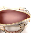 This is an authentic LOUIS VUITTON Damier Azur Braided Alma BB. This mini bowling-style handbag is crafted of Louis Vuitton's signature Damier coated canvas in white and blue. The bag features beautiful white cowhide leather trim including a solid base, pink and brown woven leather top handles, and an optional shoulder strap with brass hardware. The wrap-around zippers open to a pink fabric interior with a patch pocket.