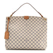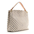 This is an authentic LOUIS VUITTON Damier Azur Graceful MM in Rose Ballerine. This hobo-style shoulder bag is crafted of Louis Vuitton's signature checkerboard coated canvas in blue and white. The bag features a flat vachetta leather shoulder strap with brass hardware and a magnetic closure. This opens the bag to a pink fabric interior with a zipper pocket.