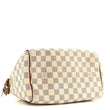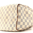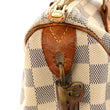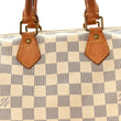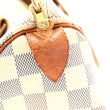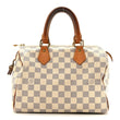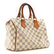 This is an authentic LOUIS VUITTON Damier Azur Speedy 25. This iconic bag is crafted of Louis Vuitton Damier checkered canvas in blue and white. The handbag features natural vachetta cowhide leather trim and rolled top handles with polished brass handle rings. The top zipper opens to a beige fabric interior with a hanging pocket.