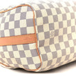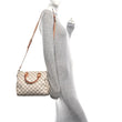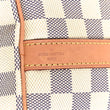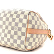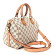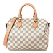 This is an authentic LOUIS VUITTON Damier Azur Speedy Bandouliere 25. This stylish handbag is crafted of Louis Vuitton's signature Damier checkered canvas in blue and white. The bag features rolled vachetta leather top handles, an optional shoulder strap, and matching trim, accented with polished brass hardware. The top zipper opens to a beige fabric interior with a hanging zipper pocket.
