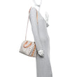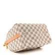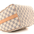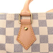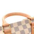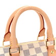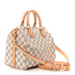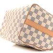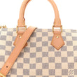This is an authentic LOUIS VUITTON Damier Azur Speedy Bandouliere 25. This stylish handbag is crafted of Louis Vuitton's signature Damier checkered canvas in blue and white. The bag features rolled vachetta leather top handles, an optional shoulder strap, and matching trim, accented with polished brass hardware. The top zipper opens to a beige fabric interior with a hanging zipper pocket.