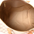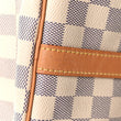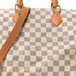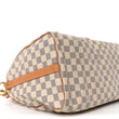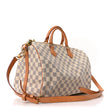 This is an authentic LOUIS VUITTON Damier Azur Speedy Bandouliere 35. This stylish tote is crafted of Louis Vuitton signature damier azur canvas. This shoulder bag features vachetta leather rolled top handles, an optional shoulder strap, leather trim and polished brass hardware. The top zipper opens to a beige fabric interior with a hanging zipper pocket.