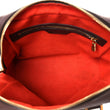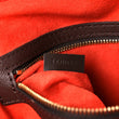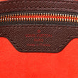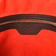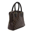 This is an authentic LOUIS VUITTON Damier Ebene Brera. This handbag is crafted of signature damier toile canvas in brown. The bag features dark brown smooth leather top handles with brass links. The top zipper opens to a burnt orange microfiber interior with a zipper pocket.
