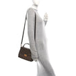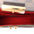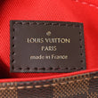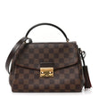 This is an authentic LOUIS VUITTON Damier Ebene Croisette. This handbag is crafted of Louis Vuitton checkerboard canvas in brown. The bag features a dark brown cowhide leather top handle, an optional leather shoulder strap, and brass hardware. The flap is secured by a brass S lock and opens to a rouge red fabric interior with a patch pocket.