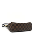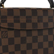 This is an authentic LOUIS VUITTON Damier Ebene Croisette. This handbag is crafted of Louis Vuitton checkerboard canvas in brown. The bag features a dark brown cowhide leather top handle, an optional leather shoulder strap, and brass hardware. The flap is secured by a brass S lock and opens to a rouge red fabric interior with a patch pocket.