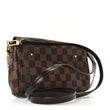 This is an authentic LOUIS VUITTON Damier Ebene Favorite PM. This bag is crafted of durable damier toile canvas. The bag features a magnetic brass logo plate on the front flap, an optional leather shoulder strap, and an attached chain strap. The flap opens to a burgundy fabric interior with a flat pocket.