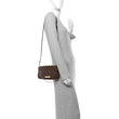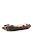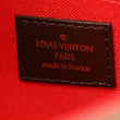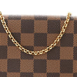 This is an authentic LOUIS VUITTON Damier Ebene Favorite PM. This bag is crafted of durable damier toile canvas. The bag features a polished brass chain strap and an optional leather shoulder strap. The front flap opens with a magnetic brass bar to a red fabric interior with a pocket.