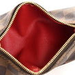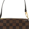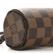 This is an authentic LOUIS VUITTON Damier Ebene Mini Papillon. This petite cylindrical handbag is crafted of Louis Vuitton signature damier coated canvas in brown. The bag features chocolate brown leather piping and a matching strap with a polished brass D-ring clasp. The top zipper opens to a terra-cotta crossgrain leather interior.