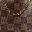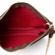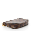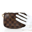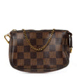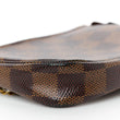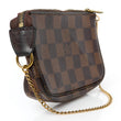 This is an authentic LOUIS VUITTON Damier Ebene Mini Pochette Accessories. This small pochette is crafted of classic brown Louis Vuitton signature Damier canvas. The pochette features a polished gold chain that can form a wristlet and a top zipper that opens to a red fabric interior.