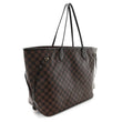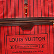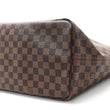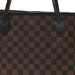 This is an authentic LOUIS VUITTON Damier Ebene Neo Neverfull GM. This tote is crafted of Louis Vuitton's checkerboard coated canvas in brown with dark brown leather trim, shoulder straps, and side cinch cords. The top is open to a red striped fabric interior with a hanging zippered pocket and d-ring.