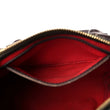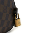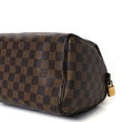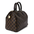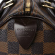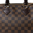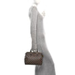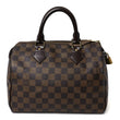 This is an authentic LOUIS VUITTON Damier Ebene Speedy 25. This handbag is finely crafted of signature Louis Vuitton Damier patterned canvas in brown. It features brown rolled leather top handles and polished brass hardware. The top zipper opens to a red fabric interior with a hanging zipper pocket.