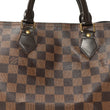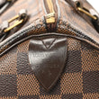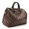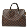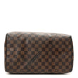 This is an authentic LOUIS VUITTON Damier Ebene Speedy 30. This stylish handbag is finely crafted of signature Louis Vuitton checkerboard coated canvas in brown. The handbag features brown rolled leather top handles and matching trim with polished gold-toned hardware. The top zipper opens to a red fabric interior with a hanging pocket.