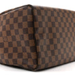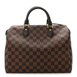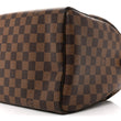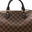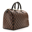This is an authentic LOUIS VUITTON Damier Ebene Speedy 30. This classic handbag is crafted of signature checkerboard coated canvas with dark brown leather trim and top handles. The top zipper opens to a red fabric interior with a hanging patch pocket.