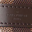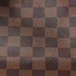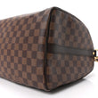 This is an authentic LOUIS VUITTON Damier Ebene Speedy Bandouliere 35. This handbag is crafted of Louis Vuitton's signature Damier checkered canvas in brown. The shoulder bag features dark brown leather trim, rolled top handles, and an optional adjustable shoulder strap with polished gold hardware. The top zippers open to a bright red fabric interior with a hanging flat pocket.