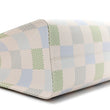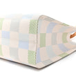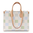 This is an authentic LOUIS VUITTON Damier Giant Onthego MM in Pistachio. This limited edition tote features oversized versions of the classic Louis Vuitton Damier with a multicolor detail. The bag features vachetta leather top handles and long strap handles. The top opens to a spacious light blue fabric interior with zipper and patch pockets.