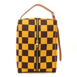 This is an authentic LOUIS VUITTON Damier Pop Shoes Bag in Yellow. This bag is crafted of supple Damier Pop coated canvas in yellow and brown. The bag features a vachetta top handle and aged gold hardware. The top zipper opens to a brown interior with a divider panel.