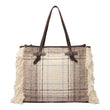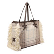 Elevate your everyday style with this stunning woven tote bag from MARCELLA. Featuring a sophisticated plaid pattern in warm brown and cream tones, this spacious bag combines structured elegance with bohemian flair. The luxurious dark brown leather handles provide comfortable carrying, while the dramatic cream fringe detailing along the sides adds a playful, vacation-ready touch. Perfect for weekend getaways, beach trips, or casual daily errands, this versatile tote effortlessly transitions from farmers market to brunch with friends. The roomy interior offers ample space for all your essentials, making it both a practical and stylish addition to your handbag collection.