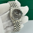 - Dial color: Dark grey dial with a fine sunray and 11 diamonds on large numeral VI, Roman Numerals as hour markers of 18k White Gold