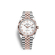 Rolex Datejust 36 watch with polished 18k Everose Gold and Stainless Steel case, Reference 126231-0015. This model has White dial with applied hour markers Roman numerals of 18k Everose Gold settings, with the Rolex Crown logo of 18k Everose Gold at the 12 o'clock position and polished 18k Everose Gold hands. Date window with a "Cyclops" magnifying lens displayed at the 3 o'clock position. Polished 18k Everose Gold "Twinlock" crown, featuring two sealed zones when the crown is screwed down: the first inside the tube of the crown, the second inside the winding crown itself. The dial closed by a Scratch-resistant Sapphire Crystal and solid case back made. The watch is equipped fluted fixed polished 18k Everose Gold bezel. The watch is mechanical self-winding Manufacture Rolex 3235 contains 31 Jewels and has an approximate power reserve of 70 hours of power reserve. This model presented on Jubilee bracelet of brushed Stainless Steel outer links and polished 18k Everose Gold center links with a Folding Oysterlock safety clasp with Easylink 5 mm comfort extension link. The water resistance is up to 100m/330ft (10 ATM). The watch is Superlative Chronometer certified: the movement is COSC certified prior to casing, then it is tested a second time by Rolex after being cased to ensure accuracy.
