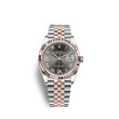 Rolex Datejust 36 watch with polished 18k Everose Gold and Stainless Steel case, Reference 126231-0023. This model has Grey 'Dark Rhodium' dial with a fine sunray finish. The dial is adorned applied polished 18k Everose Gold Roman numeral hour markers also VI and IX in 18k Everose gold, set with 24 diamonds and polished 18k Everose Gold hands. Fine printed minute track on teh dial perimeter. Date window with a "Cyclops" magnifying lens displayed at the 3 o'clock position. Polished 18k Everose Gold "Twinlock" crown, featuring two sealed zones when the crown is screwed down: the first inside the tube of the crown, the second inside the winding crown itself. The dial closed by a Scratch-resistant Sapphire Crystal and solid case back made. The watch is equipped fluted fixed polished 18k Everose Gold bezel. The watch is mechanical self-winding Manufacture Rolex 3235 contains 31 Jewels and has an approximate power reserve of 70 hours of power reserve. This model presented on Jubilee bracelet of brushed Stainless Steel outer links and polished 18k Everose Gold center links with a Folding Oysterlock safety clasp with Easylink 5 mm comfort extension link. The water resistance is up to 100m/330ft (10 ATM). The watch is Superlative Chronometer certified: the movement is COSC certified prior to casing, then it is tested a second time by Rolex after being cased to ensure accuracy.