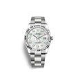 Rolex Datejust 36 watch with polished Stainless Steel and 18k White Gold case, Reference 126234-0020. This model has White mother-of-pearl dial set with diamonds. The dial is adorned Rolex Crown logo of 18k White Gold at the 12 o'clock position, polished 18k White Gold hands and hour markers are 10 Diamonds in 18k White Gold settings. Date window with a "Cyclops" magnifying lens displayed at the 3 o'clock position. The dial closed by a Scratch-resistant Sapphire Crystal and solid case back made. The watch is equipped fluted fixed polished 18k White Gold bezel and polished Stainless Steel "Twinlock" crown with double waterproofness system. The watch is mechanical self-winding Manufacture Rolex 3235 contains 31 Jewels and has an approximate power reserve of 70 hours of power reserve. This model presented on Oyster bracelet of brushed outer and polished center links Stainless Steel with a Folding Oysterlock safety clasp with Easylink 5 mm comfort extension link. The water resistance is up to 100m/330ft (10 ATM). Superlative Chronometer certified: the movement is COSC certified prior to casing, then it is subjected to a rigorous second test by Rolex after casing to ensure precision of +/- 2 seconds per day, power reserve, water-resistance and self-winding.