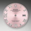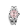 Rolex Datejust 36 watch with polished Stainless Steel and 18k White Gold case, Reference 126234-0031. This model has Pink set with diamonds dial and a fine sunray finish. The dial is adorned Rolex Crown logo of 18k White Gold at the 12 o'clock position, polished 18k White Gold hands and 18k White Gold Roman numeral hour markers also VI and IX in 18k White gold, set with 24 diamonds. Fine printed minute track on teh dial perimeter. Date window with a "Cyclops" magnifying lens displayed at the 3 o'clock position. The dial closed by a Scratch-resistant Sapphire Crystal and solid case back made. The watch is equipped fluted fixed polished 18k White Gold bezel and polished Stainless Steel "Twinlock" crown with double waterproofness system. The watch is mechanical self-winding Manufacture Rolex 3235 contains 31 Jewels and has an approximate power reserve of 70 hours of power reserve. This model presented on Jubilee bracelet of brushed outer and polished center links Stainless Steel with a Folding Oysterlock safety clasp with Easylink 5 mm comfort extension link. The water resistance is up to 100m/330ft (10 ATM). Superlative Chronometer certified: the movement is COSC certified prior to casing, then it is subjected to a rigorous second test by Rolex after casing to ensure precision of +/- 2 seconds per day, power reserve, water-resistance and self-winding.