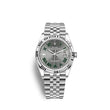 Rolex Datejust 36 watch with polished Stainless Steel and 18k White Gold case, Reference 126234-0045. This model has Slate dial with a fine sunray finish and highly legible Chromalight display with long-lasting blue luminescence. The dial is adorned Rolex Crown logo of 18k White Gold at the 12 o'clock position polished 18k White Gold hands - hour and minute hands with partial luminous fill, and applied polished Green colored Roman numerals hour markers. Fine printed minute track on teh dial perimeter with Arabic numerals marking every 5-minute interval. Date window with a "Cyclops" magnifying lens displayed at the 3 o'clock position. The dial closed by a Scratch-resistant Sapphire Crystal and solid case back made. The watch is equipped fluted fixed polished 18k White Gold bezel and polished Stainless Steel "Twinlock" crown with double waterproofness system. The watch is mechanical self-winding Manufacture Rolex 3235 contains 31 Jewels and has an approximate power reserve of 70 hours of power reserve. This model presented on Jubilee bracelet of brushed outer and polished center links Stainless Steel with a Folding Oysterlock safety clasp with Easylink 5 mm comfort extension link. The water resistance is up to 100m/330ft (10 ATM).