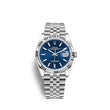 Rolex Datejust 36 watch with polished Stainless Steel and 18k White Gold case, Reference 126234-0049. This model has Bright blue dial with fluted motif and highly legible Chromalight display with long-lasting blue luminescence. The dial is adorned Rolex Crown logo of 18k White Gold at the 12 o'clock position, polished 18k White Gold hands - hour and minute hands with partial luminous fill, and applied polished 18k White Gold index hour markers with luminescent fill. Fine printed minute track on teh dial perimeter. Date window with a "Cyclops" magnifying lens displayed at the 3 o'clock position. The dial closed by a Scratch-resistant Sapphire Crystal and solid case back made. The watch is equipped fluted fixed polished 18k White Gold bezel and polished Stainless Steel "Twinlock" crown with double waterproofness system. The watch is mechanical self-winding Manufacture Rolex 3235 contains 31 Jewels and has an approximate power reserve of 70 hours of power reserve. This model presented on Jubilee bracelet of brushed outer and polished center links Stainless Steel with a Folding Oysterlock safety clasp with Easylink 5 mm comfort extension link. The water resistance is up to 100m/330ft (10 ATM).