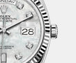 - Dial color: White mother-of-pearl dial with a 10 Diamonds as hour markers framed in 18k Everose Gold, 2 of which are baguette-cut at 6 and 9 o'clock